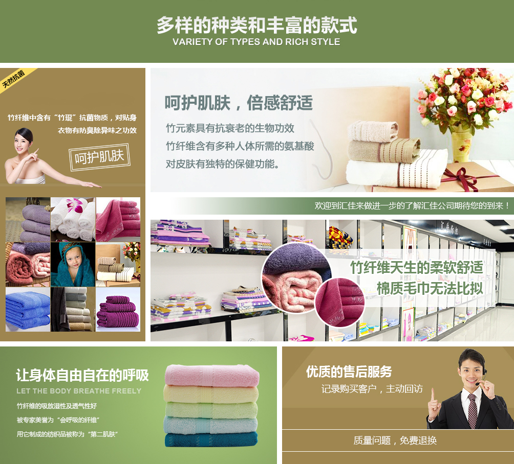 德州匯佳紡織品有限公司專業(yè)生產(chǎn)竹纖維毛巾,是竹纖維毛巾品牌廠家,并且提供竹纖維毛巾禮盒套裝用于福利和禮品。公司座落于山東德州,交通十分便利,公司近臨京滬高速公路,距離德州火車站、汽車站10公里京滬高鐵5公里,濟(jì)南國(guó)際機(jī)場(chǎng)120公里。